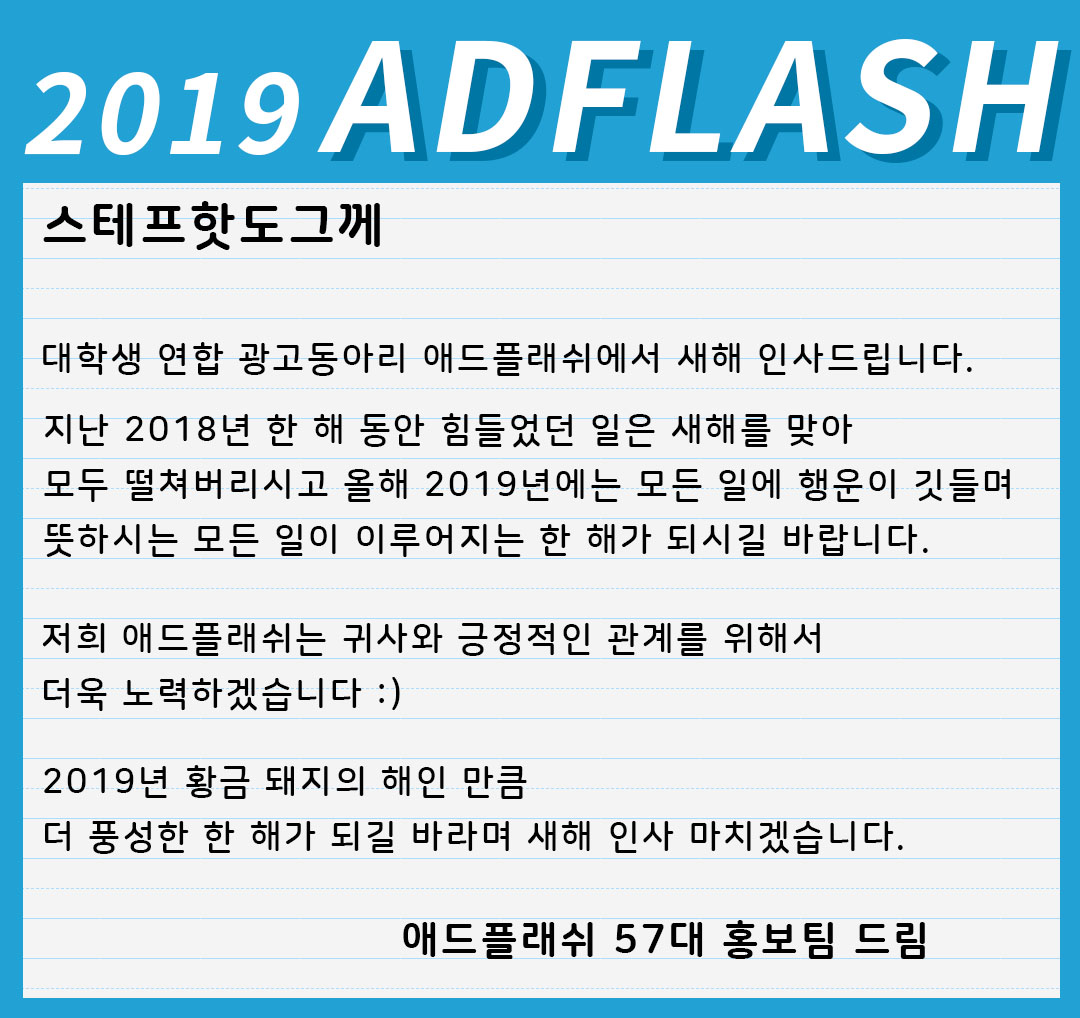 마지막으로 지난 한 해, 애드플래쉬에 지속적으로 관심을 가져주셔서 감사하다는 의미를 담아 연하장을 함께 보내드립니다. 2019년에도 담당자님과 귀사에 행운과 평안이 가득하기를 기원합니다.