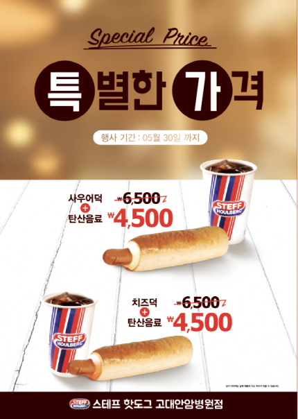 3.양재역점(~5/13까지) : 핫도그(단품) 구매시 무료 세트업그레이드(사이드+탄산음료 증정)!